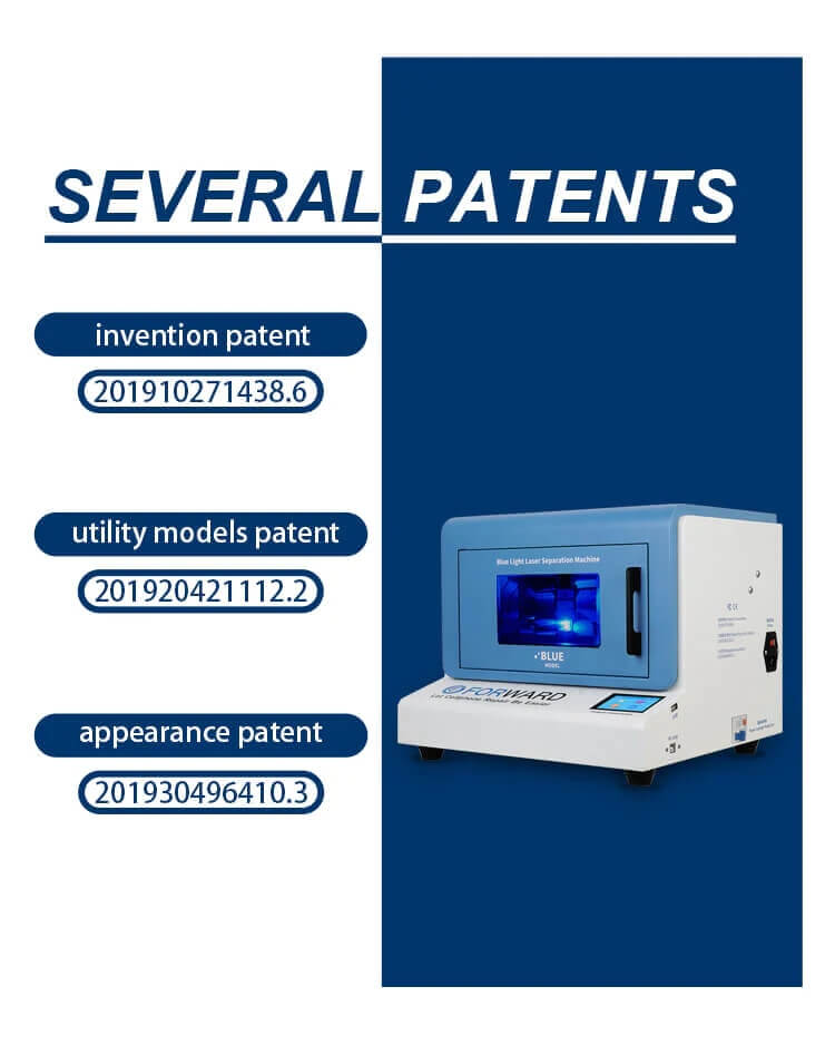 6. Put a large amount of money to develop a new technology. This new technology finally can launch after one year, it can solve the current most popular variety disadvantages of the optical fiber laser machine. The blue light laser separation machine has several patents, including invention patent, utility models patent and appearance patent.